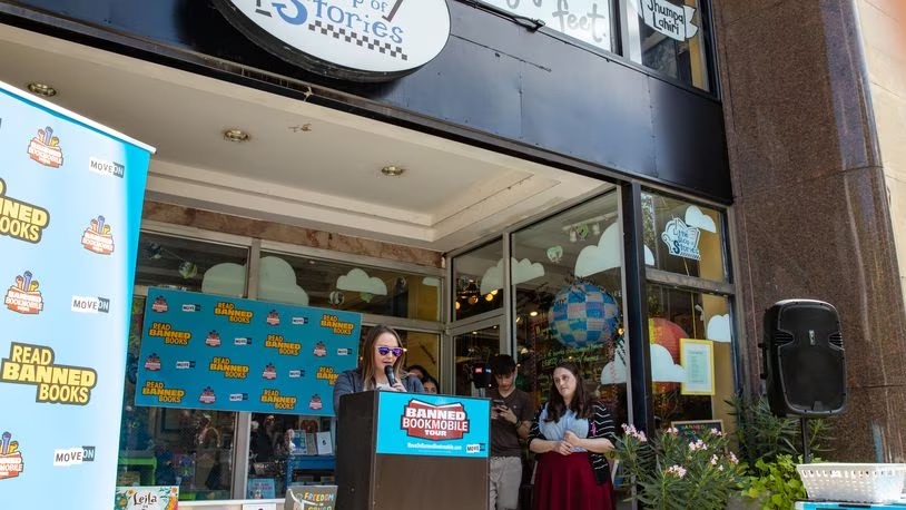 Standing in front of Little Shop of Stories in Decatur Square on Sunday, fired Cobb teacher Katie Rinderle encouraged the crowd of about 50 to read banned books.