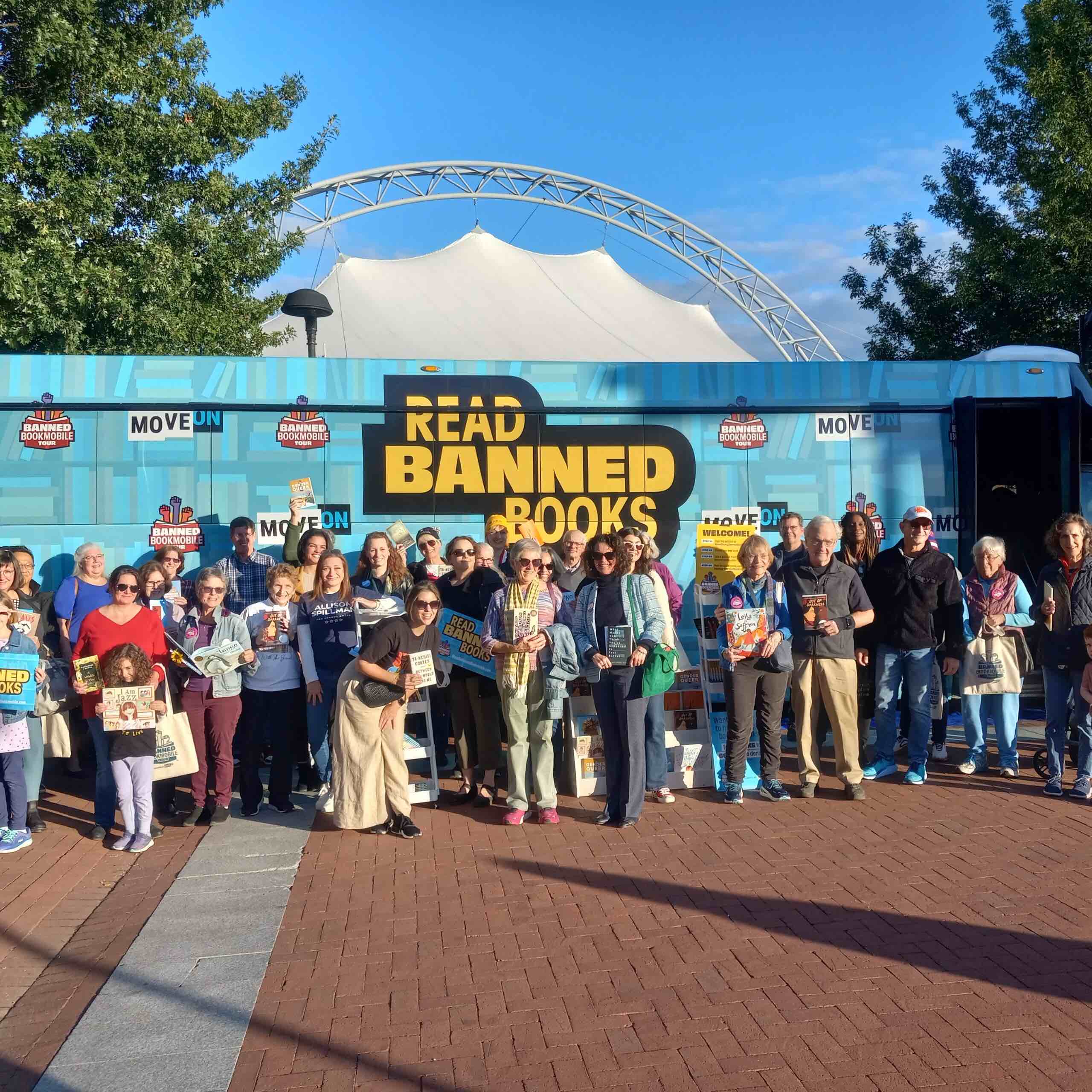 MoveOn’s Banned Bookmobile stopped by Charlottesville’s Free Speech Wall on Wednesday, October 18, as part of its national tour to address the rising wave of book bannings in Virginia and across the country.